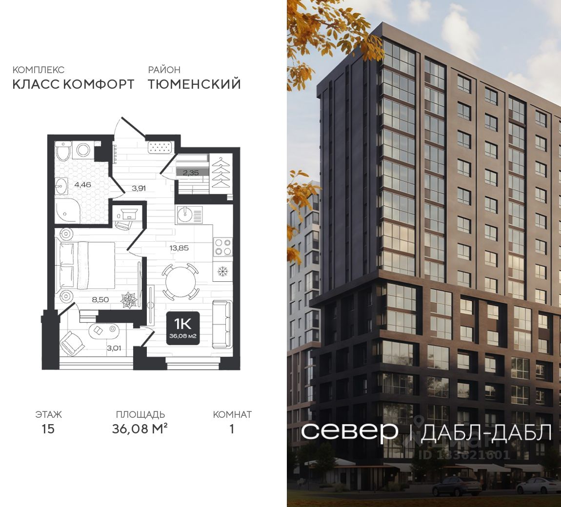 Продаётся квартира площадью 36.08 м2 в жилом комплексе "Дабл-Дабл". Квартира находится на 15 этаже, жилая площадь квартиры 8.50 м2, площадь просторной кухни — 13.85 м2. Среди особенностей планировки — изолированные комнаты с окнами на одну сторону, 1 совмещённый санузел.