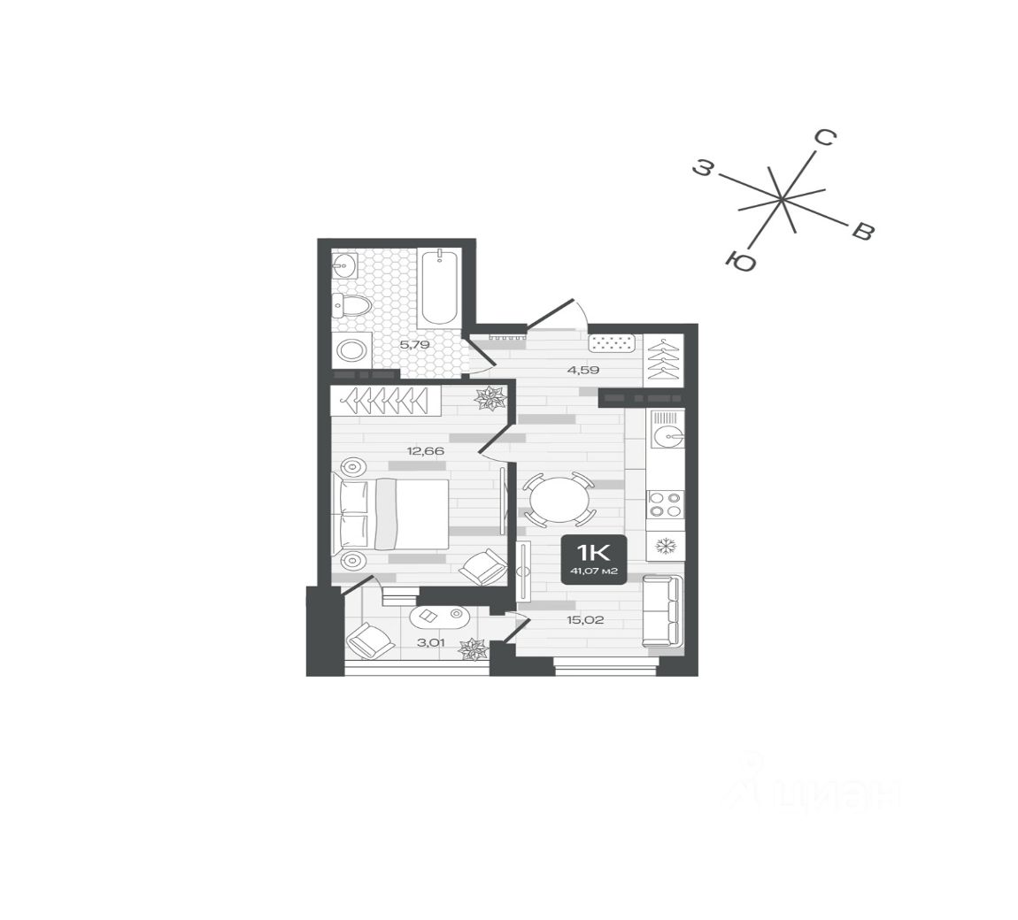 Продаётся квартира площадью 41.07 м2 в жилом комплексе "Дабл-Дабл".