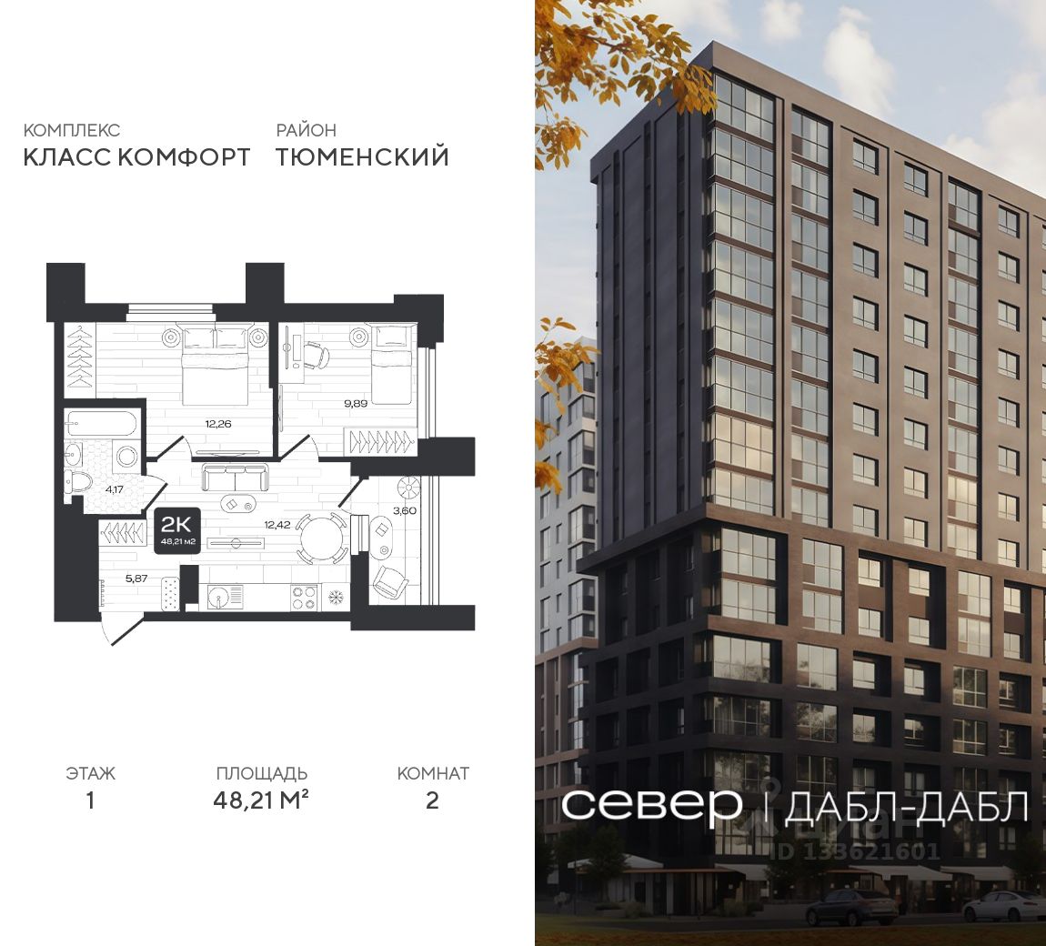 Продаётся квартира площадью 48.21 м2 в жилом комплексе "Дабл-Дабл". Квартира находится на 1 этаже, жилая площадь квартиры 22.15 м2, площадь просторной кухни — 12.42 м2. Среди особенностей планировки — изолированные комнаты с окнами на одну сторону, 1 совмещённый санузел.