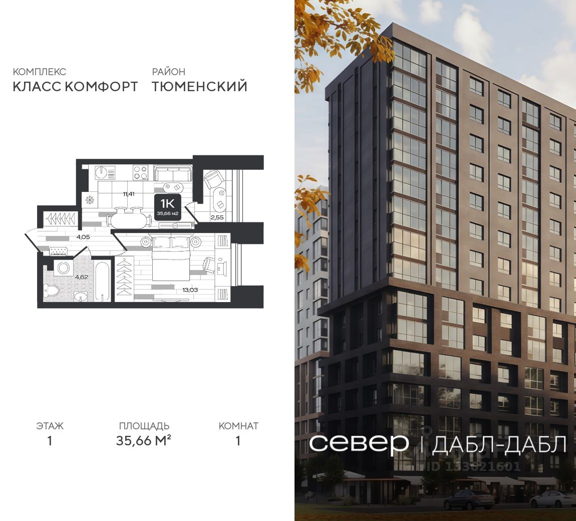 Продаётся квартира площадью 35.66 м2 в жилом комплексе "Дабл-Дабл". Квартира находится на 1 этаже, жилая площадь квартиры 13.03 м2, площадь просторной кухни — 11.41 м2. Среди особенностей планировки — изолированные комнаты с окнами на одну сторону, 1 совмещённый санузел.