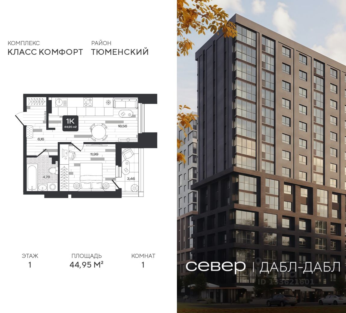Продаётся квартира площадью 44.95 м2 в жилом комплексе "Дабл-Дабл". Квартира находится на 1 этаже, жилая площадь квартиры 11.99 м2, площадь просторной кухни — 18.56 м2. Среди особенностей планировки — изолированные комнаты с окнами на одну сторону, 1 совмещённый санузел.