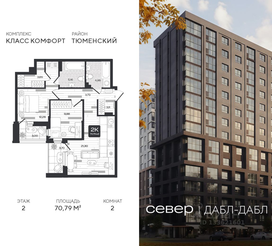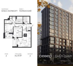 Продаётся квартира площадью 70.79 м2 в жилом комплексе "Дабл-Дабл". Квартира находится на 2 этаже, жилая площадь квартиры 22.16 м2, площадь просторной кухни — 21.30 м2. Среди особенностей планировки — изолированные комнаты с окнами на одну сторону, 1 совмещённый санузел.