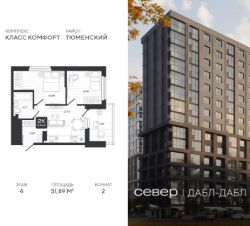 Продаётся квартира площадью 51.89 м2 в жилом комплексе "Дабл-Дабл". Квартира находится на 4 этаже, жилая площадь квартиры 22.15 м2, площадь просторной кухни — 12.42 м2. Среди особенностей планировки — изолированные комнаты с окнами на одну сторону, 1 совмещённый санузел.