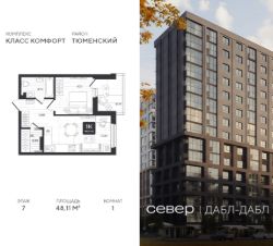Продаётся квартира площадью 48.11 м2 в жилом комплексе "Дабл-Дабл". Квартира находится на 7 этаже, жилая площадь квартиры 10.11 м2, площадь просторной кухни — 17.30 м2. Среди особенностей планировки — изолированные комнаты с окнами на одну сторону, 1 совмещённый санузел.
