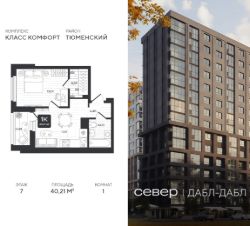 Продаётся квартира площадью 40.21 м2 в жилом комплексе "Дабл-Дабл". Квартира находится на 7 этаже, жилая площадь квартиры 13.01 м2, площадь просторной кухни — 11.91 м2. Среди особенностей планировки — изолированные комнаты с окнами на одну сторону, 1 совмещённый санузел.