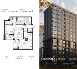 Продаётся квартира площадью 70.79 м2 в жилом комплексе "Дабл-Дабл". Квартира находится на 7 этаже, жилая площадь квартиры 22.16 м2, площадь просторной кухни — 21.30 м2. Среди особенностей планировки — изолированные комнаты с окнами на одну сторону, 1 совмещённый санузел.
