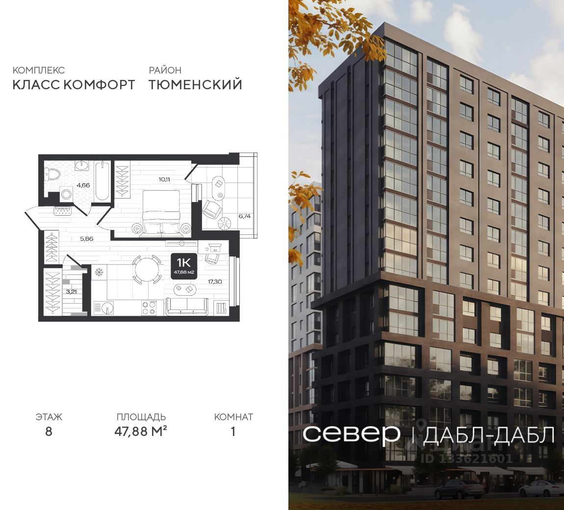 Продаётся квартира площадью 47.88 м2 в жилом комплексе "Дабл-Дабл". Квартира находится на 8 этаже, жилая площадь квартиры 10.11 м2, площадь просторной кухни — 17.30 м2. Среди особенностей планировки — изолированные комнаты с окнами на одну сторону, 1 совмещённый санузел.