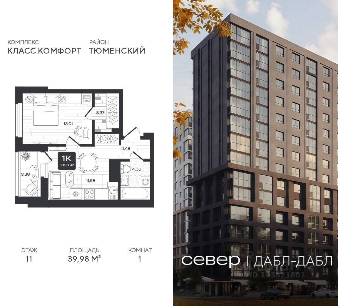 Продаётся квартира площадью 39.98 м2 в жилом комплексе "Дабл-Дабл". Квартира находится на 11 этаже, жилая площадь квартиры 13.01 м2, площадь просторной кухни — 11.68 м2. Среди особенностей планировки — изолированные комнаты с окнами на одну сторону, 1 совмещённый санузел.