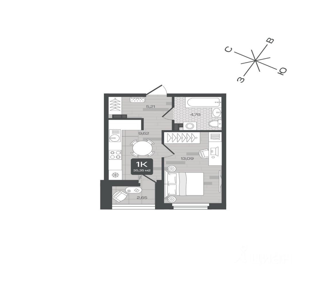 Квартира находится на 1 этаже дома, который будет введен в эксплуатацию во 2 квартале 2028 года. Жилая площадь квартиры 13.09 м2, площадь просторной кухни — 9.62 м2. Среди особенностей планировки — изолированные комнаты с окнами на одну сторону, 1 совмещённый санузел.