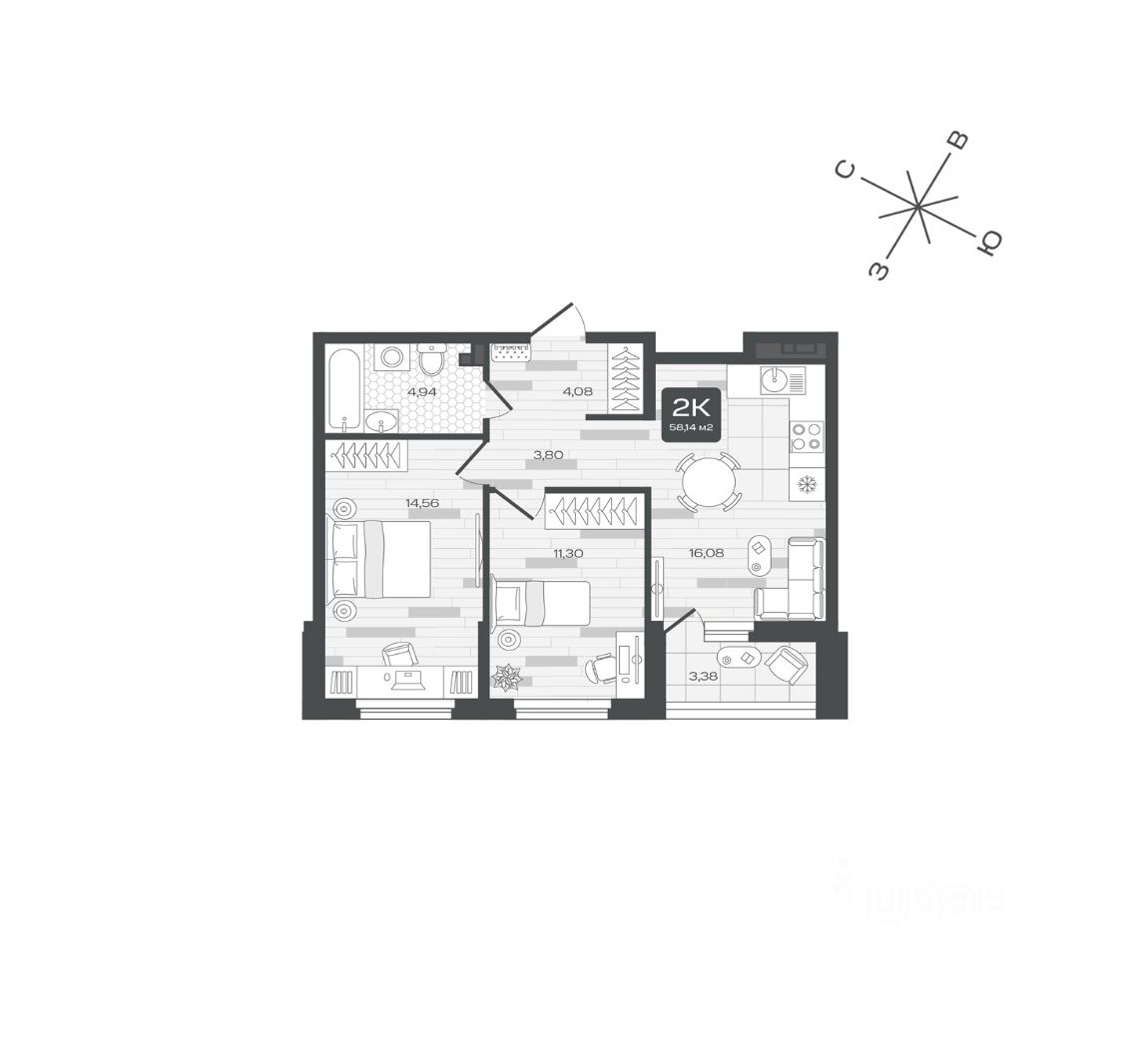 Продаётся квартира площадью 58.14 м2 в жилом комплексе "Дабл-Дабл".