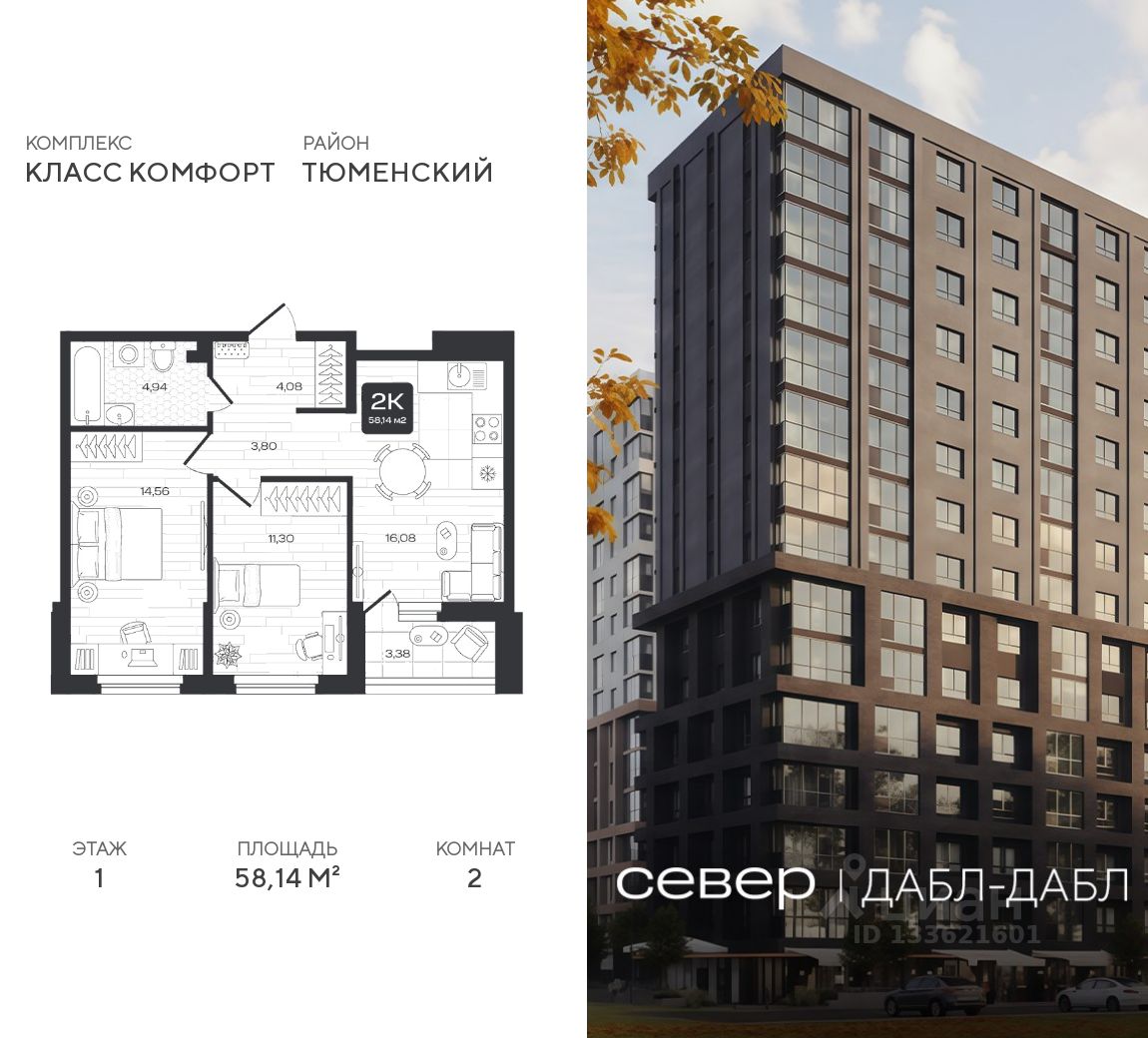 Продаётся квартира площадью 58.14 м2 в жилом комплексе "Дабл-Дабл". Квартира находится на 1 этаже, жилая площадь квартиры 25.86 м2, площадь просторной кухни — 16.08 м2. Среди особенностей планировки — изолированные комнаты с окнами на одну сторону, 1 совмещённый санузел.