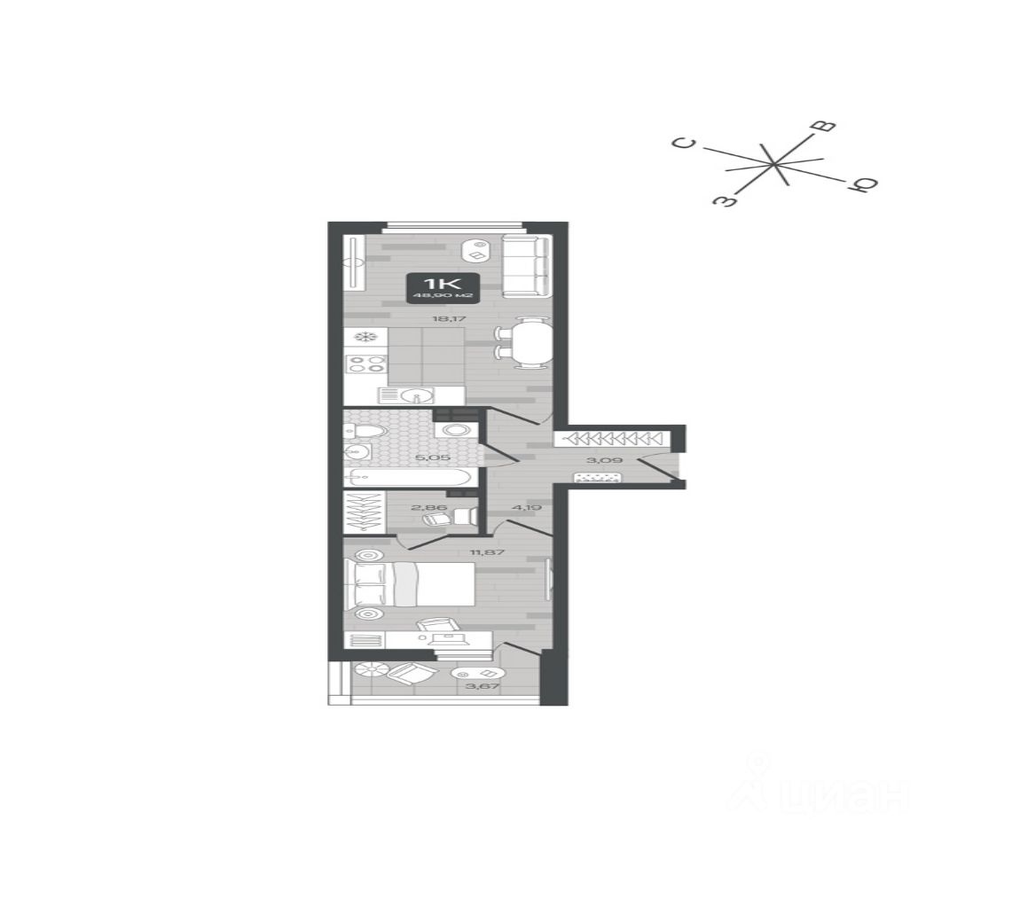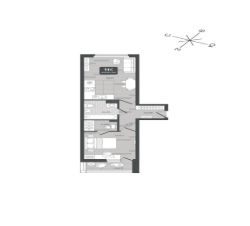 Квартира находится на 1 этаже дома, который будет введен в эксплуатацию во 2 квартале 2028 года. Жилая площадь квартиры 11.87 м2, площадь просторной кухни — 18.17 м2. Среди особенностей планировки — изолированные комнаты с окнами на одну сторону, 1 совмещённый санузел.