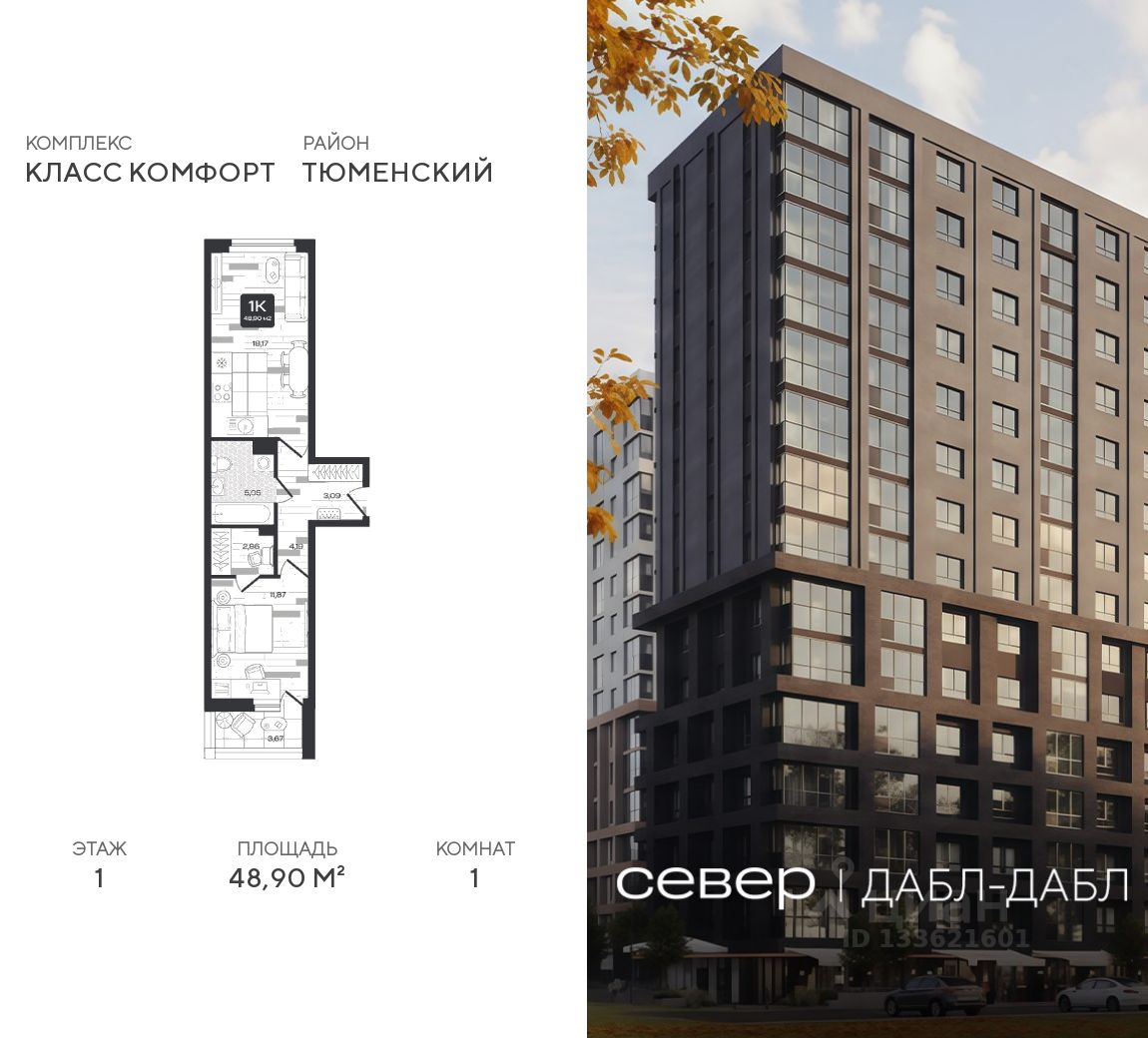Продаётся квартира площадью 48.90 м2 в жилом комплексе "Дабл-Дабл". Квартира находится на 1 этаже, жилая площадь квартиры 11.87 м2, площадь просторной кухни — 18.17 м2. Среди особенностей планировки — изолированные комнаты с окнами на одну сторону, 1 совмещённый санузел.