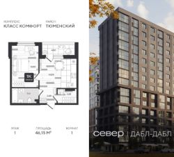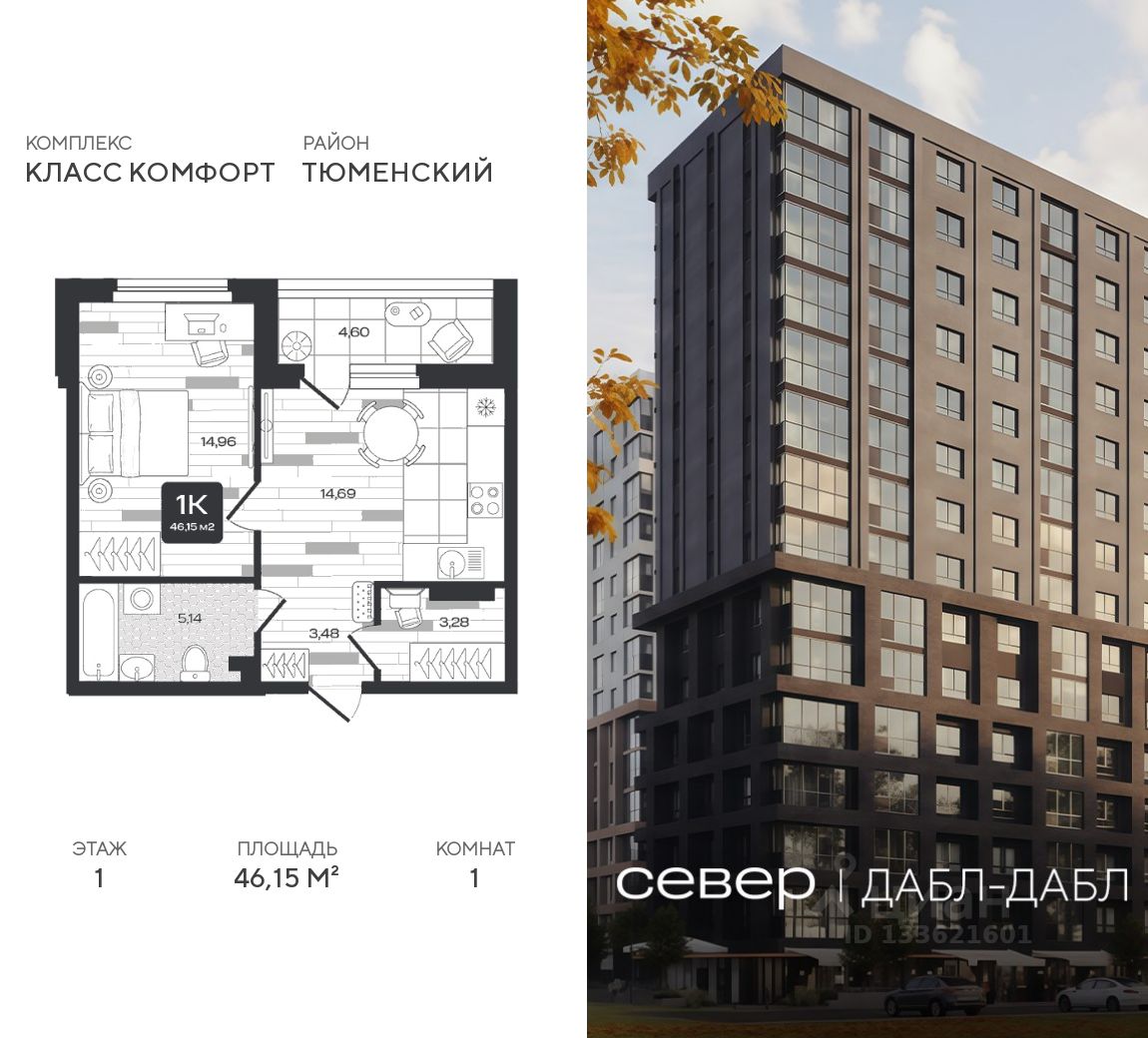 Продаётся квартира площадью 46.15 м2 в жилом комплексе "Дабл-Дабл". Квартира находится на 1 этаже, жилая площадь квартиры 14.96 м2, площадь просторной кухни — 14.69 м2. Среди особенностей планировки — изолированные комнаты с окнами на одну сторону, 1 совмещённый санузел.