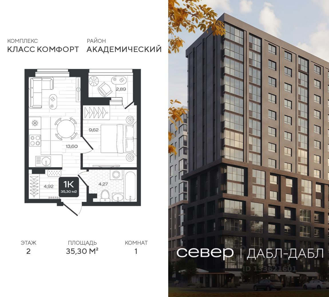 Квартира находится на 2 этаже дома, который будет введен в эксплуатацию во 2 квартале 2028 года. Жилая площадь квартиры 9.62 м2, площадь просторной кухни — 13.60 м2. Среди особенностей планировки — изолированные комнаты с окнами на одну сторону, 1 совмещённый санузел.