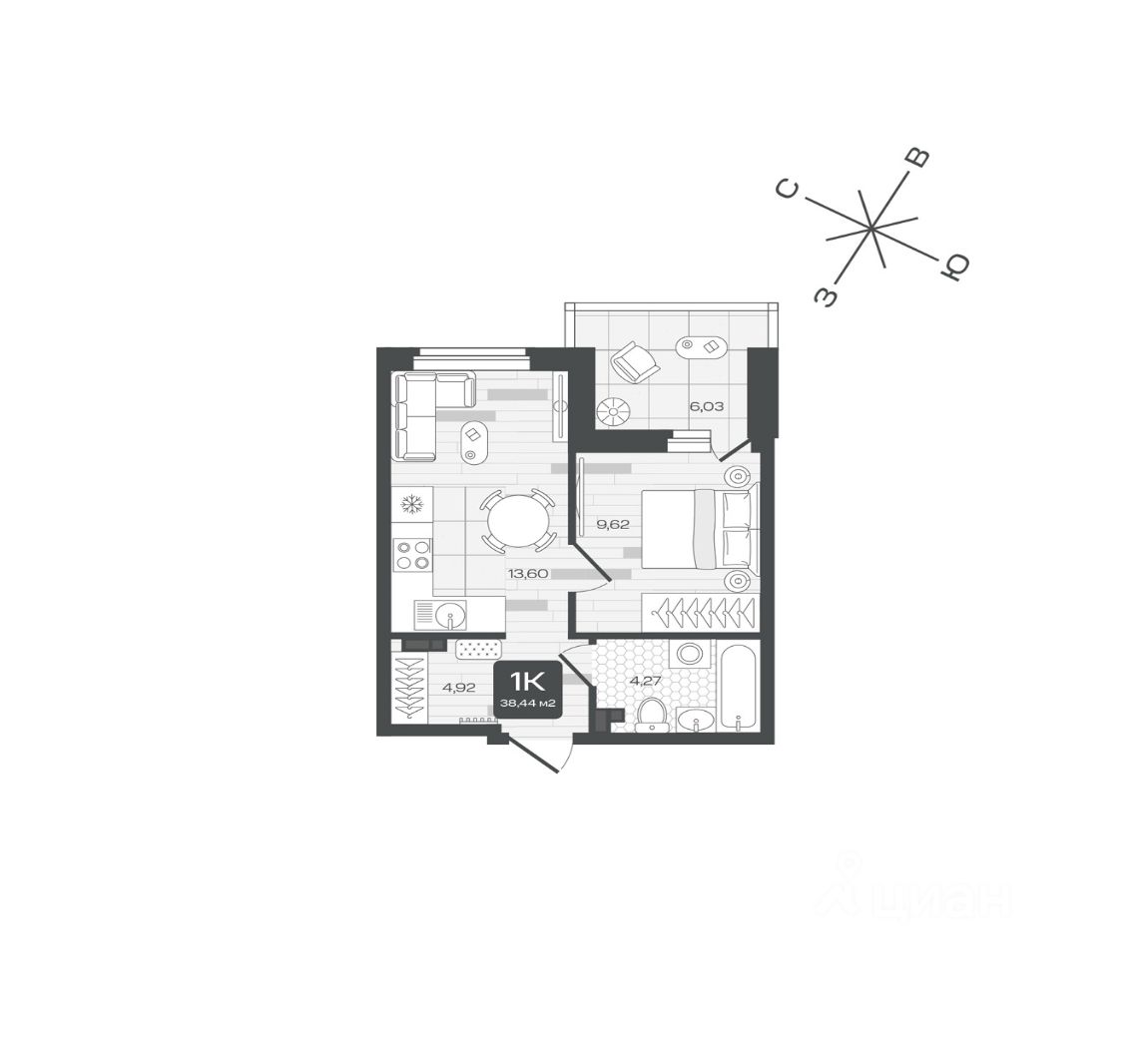 Квартира находится на 7 этаже дома, который будет введен в эксплуатацию во 2 квартале 2028 года. Жилая площадь квартиры 9.62 м2, площадь просторной кухни — 13.60 м2. Среди особенностей планировки — изолированные комнаты с окнами на одну сторону, 1 совмещённый санузел.