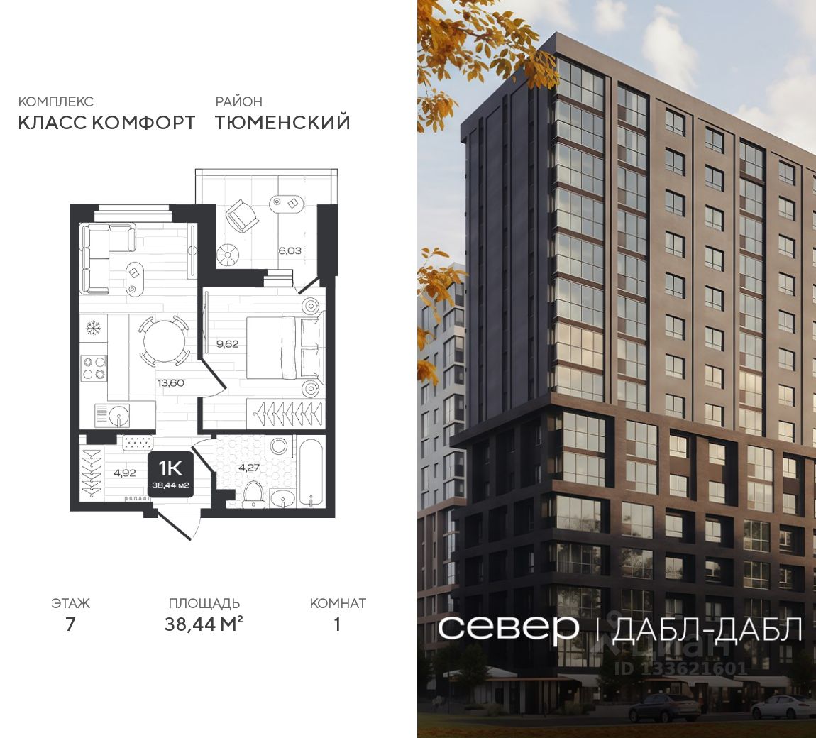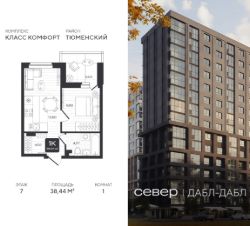 Продаётся квартира площадью 38.44 м2 в жилом комплексе "Дабл-Дабл". Квартира находится на 7 этаже, жилая площадь квартиры 9.62 м2, площадь просторной кухни — 13.60 м2. Среди особенностей планировки — изолированные комнаты с окнами на одну сторону, 1 совмещённый санузел.