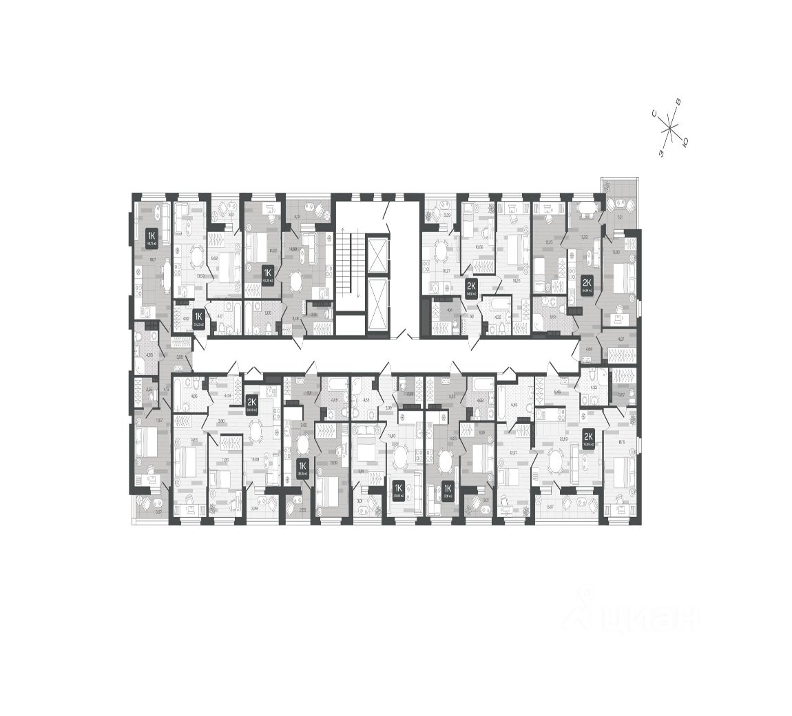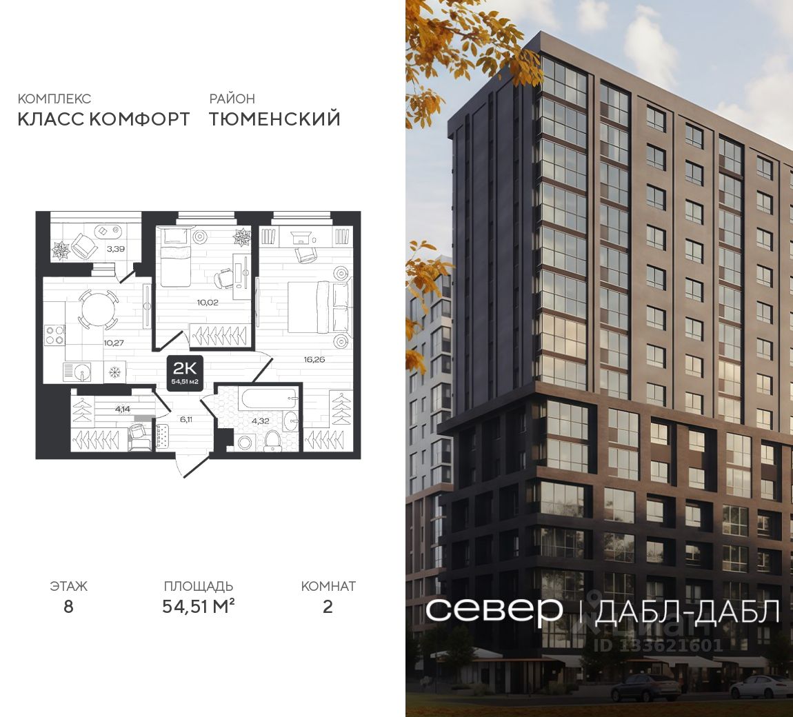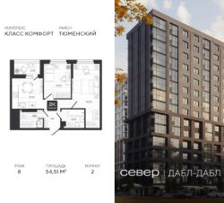 Продаётся квартира площадью 54.51 м2 в жилом комплексе "Дабл-Дабл". Квартира находится на 8 этаже, жилая площадь квартиры 26.28 м2, площадь просторной кухни — 10.27 м2. Среди особенностей планировки — изолированные комнаты с окнами на одну сторону, 1 совмещённый санузел.