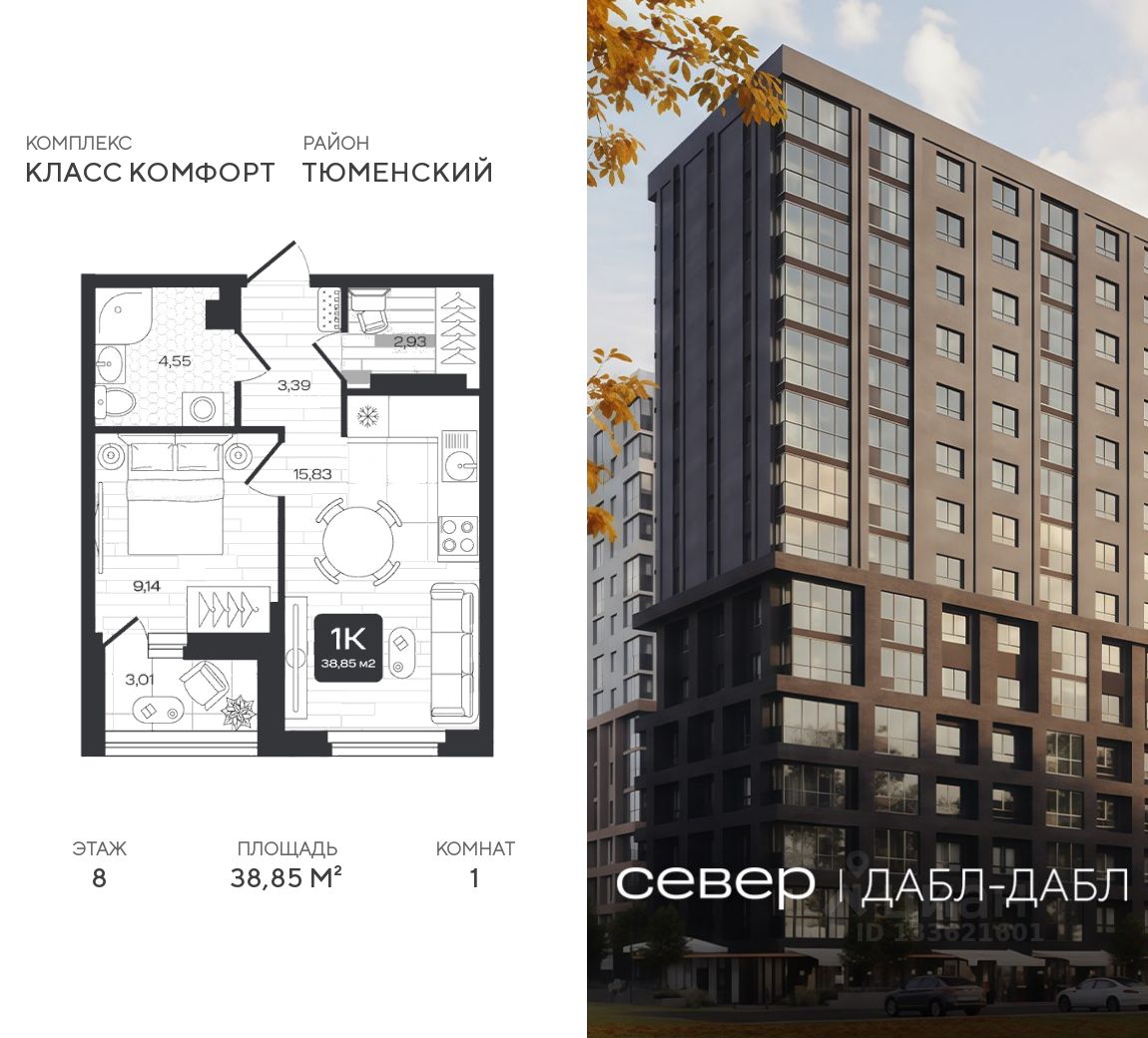 Продаётся квартира площадью 38.85 м2 в жилом комплексе "Дабл-Дабл". Квартира находится на 8 этаже, жилая площадь квартиры 9.14 м2, площадь просторной кухни — 15.83 м2. Среди особенностей планировки — изолированные комнаты с окнами на одну сторону, 1 совмещённый санузел.