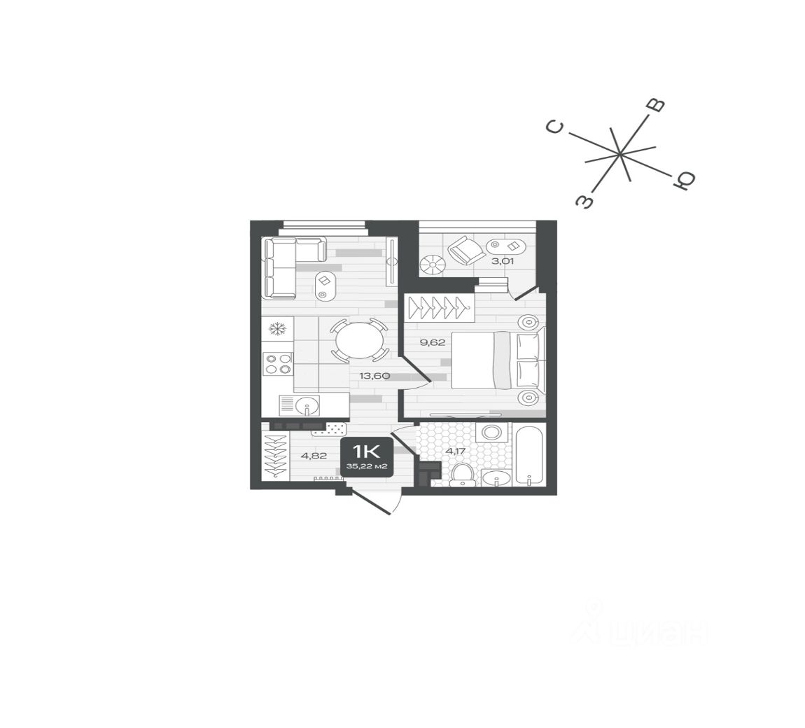 Квартира находится на 8 этаже дома, который будет введен в эксплуатацию во 2 квартале 2028 года. Жилая площадь квартиры 9.62 м2, площадь просторной кухни — 13.60 м2. Среди особенностей планировки — изолированные комнаты с окнами на одну сторону, 1 совмещённый санузел.