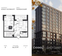 Продаётся квартира площадью 46.09 м2 в жилом комплексе "Дабл-Дабл". Квартира находится на 8 этаже, жилая площадь квартиры 14.96 м2, площадь просторной кухни — 14.69 м2. Среди особенностей планировки — изолированные комнаты с окнами на одну сторону, 1 совмещённый санузел.
