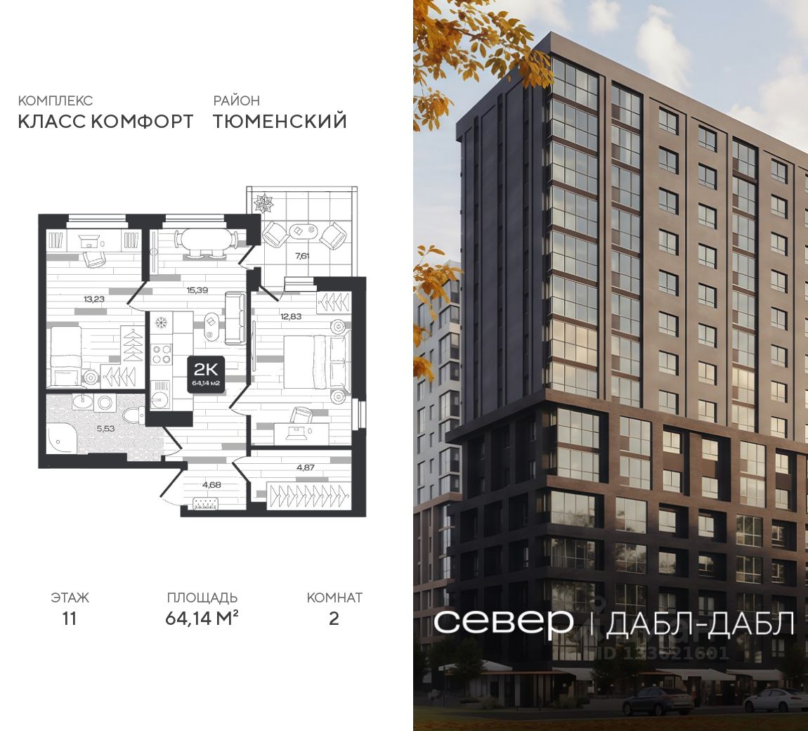 Продаётся квартира площадью 64.14 м2 в жилом комплексе "Дабл-Дабл". Квартира находится на 11 этаже, жилая площадь квартиры 26.06 м2, площадь просторной кухни — 15.39 м2. Среди особенностей планировки — изолированные комнаты с окнами на одну сторону, 1 совмещённый санузел.