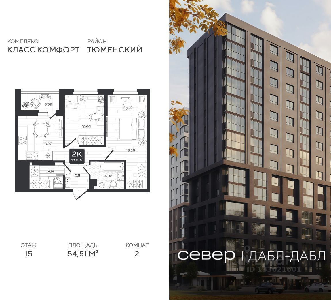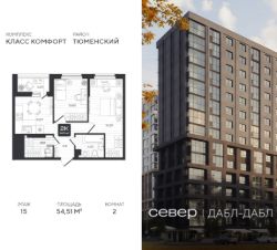 Продаётся квартира площадью 54.51 м2 в жилом комплексе "Дабл-Дабл". Квартира находится на 15 этаже, жилая площадь квартиры 26.28 м2, площадь просторной кухни — 10.27 м2. Среди особенностей планировки — изолированные комнаты с окнами на одну сторону, 1 совмещённый санузел.