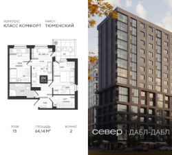 Продаётся квартира площадью 64.14 м2 в жилом комплексе "Дабл-Дабл". Квартира находится на 15 этаже, жилая площадь квартиры 26.06 м2, площадь просторной кухни — 15.39 м2. Среди особенностей планировки — изолированные комнаты с окнами на одну сторону, 1 совмещённый санузел.