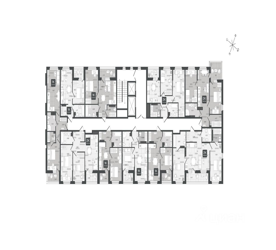 - квартиры от 1-комнатных до 2-уровневых