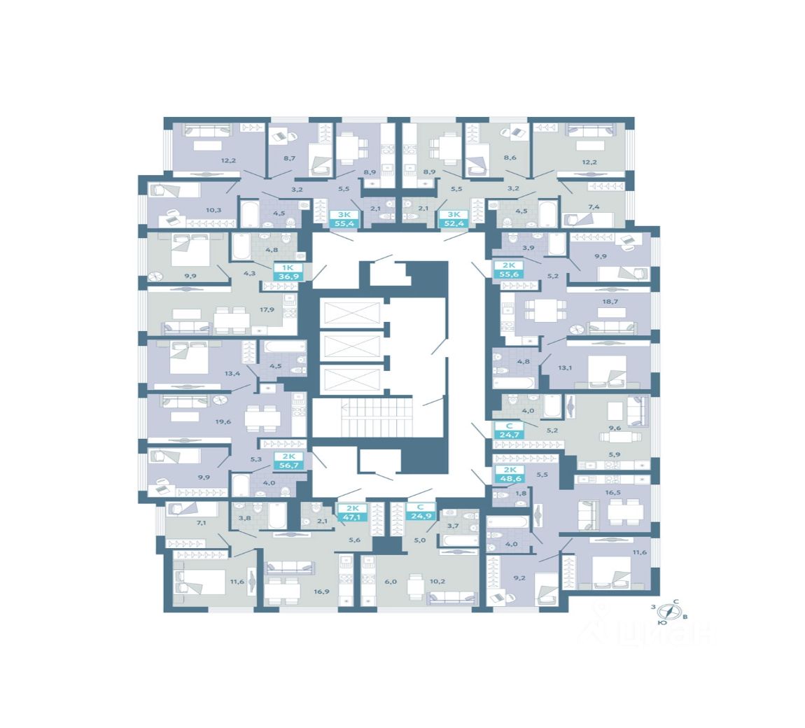 Квартира находится на 13 этаже, жилая площадь квартиры 9.90 м2, площадь просторной кухни — 17.90 м2. Среди особенностей планировки — изолированные комнаты с окнами на одну сторону, 1 совмещённый санузел.