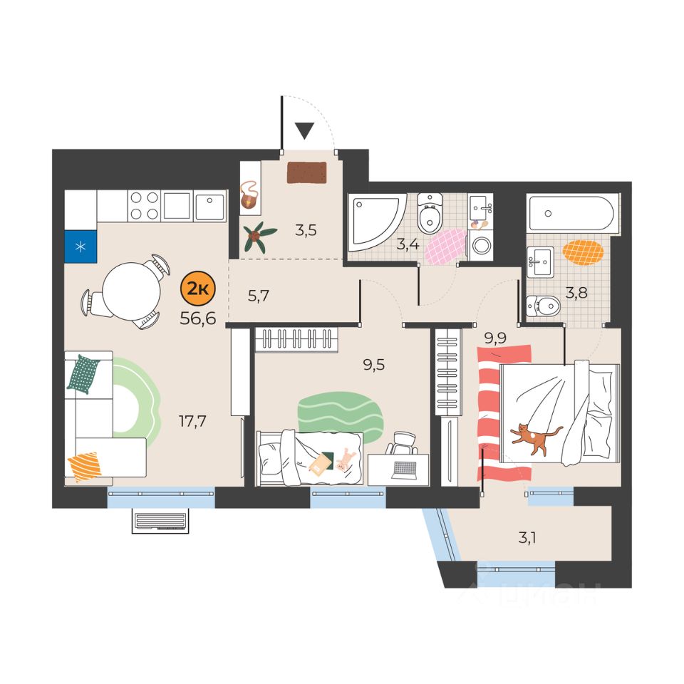 Общая площадь54,4 м²