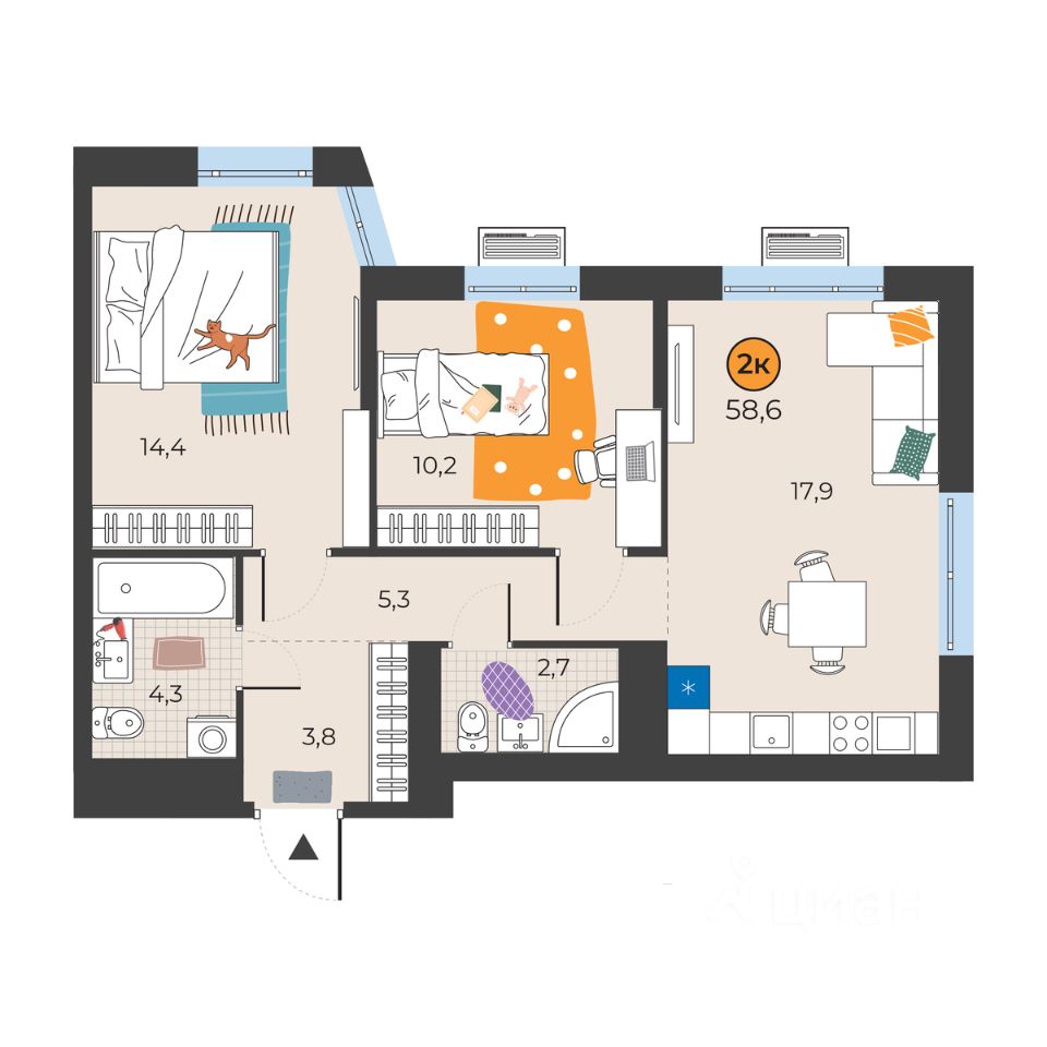 Общая площадь58,6 м²