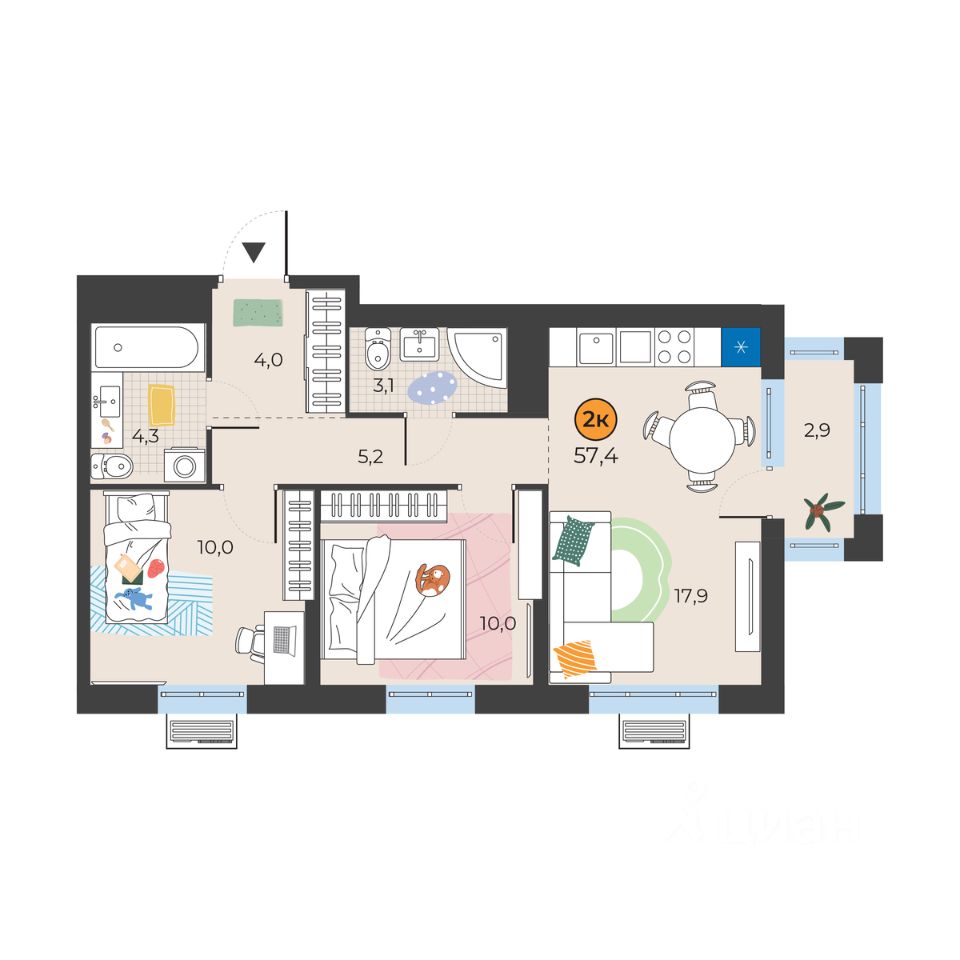Общая площадь55,4 м²