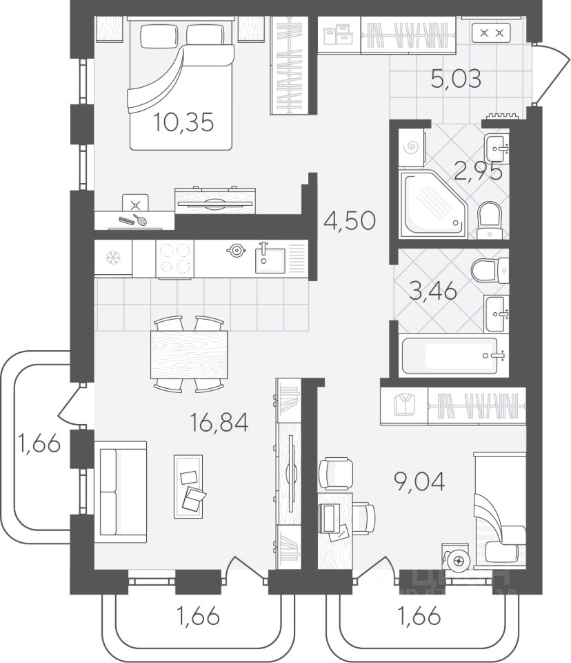 Квартира с 2 спальнями площадью 57,15 кв.м