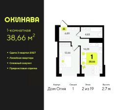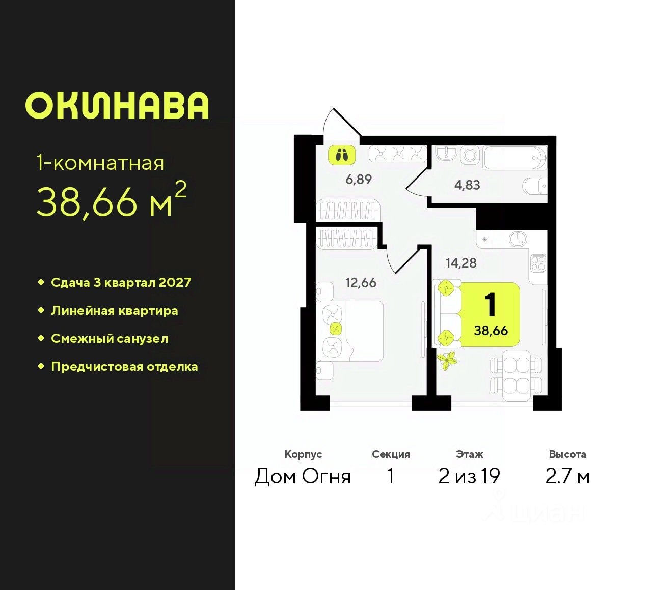 Однокомнатная квартира с предчистовой отделкой в ЖК "Окинава" на 2 этаже. Общая площадь: 38.66 кв.м., жилая: 12.66 кв.м., площадь просторной кухни-столовой: 14.28 кв.м. Все окна выходят на одну сторону. В квартире один совмещенный санузел. Высота потолков 2.7 м.