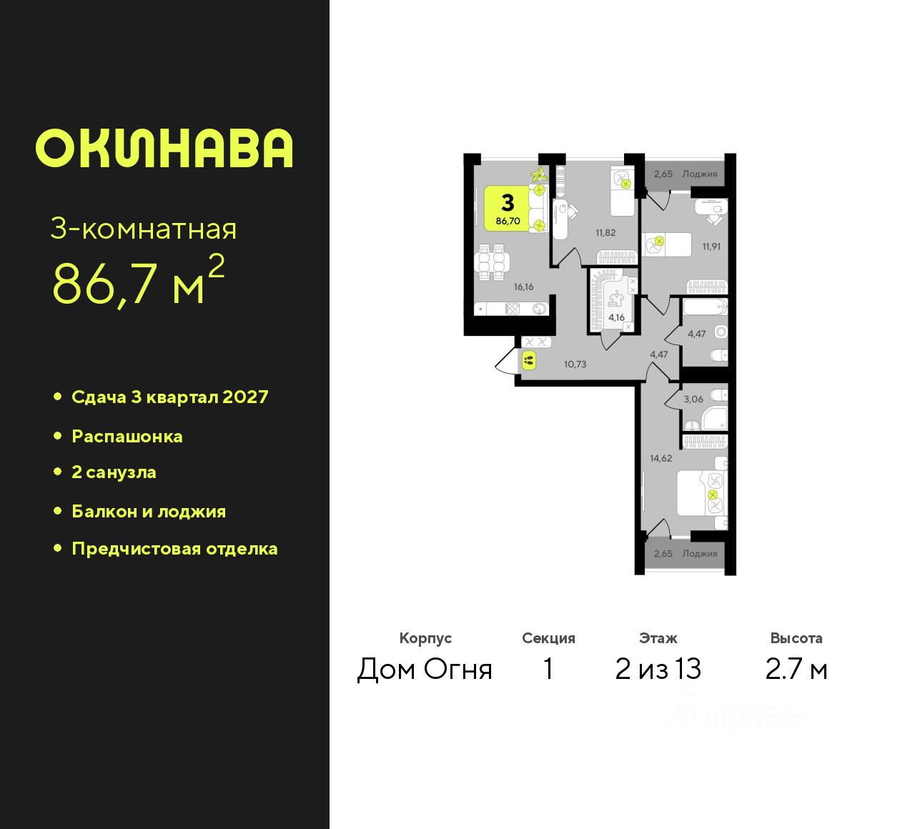 3-комн. квартира от застройщика с предчистовой отделкой в ЖК "Окинава" на 2 этаже. Общая площадь: 86.7 кв.м., жилая: 38.35 кв.м., площадь просторной кухни-столовой: 16.16 кв.м. Квартира - распашонка, без проходных комнат, окна выходят на paзные стороны дома. В квартире один балкон и одна лоджия, два совмещенных санузла. Высота потолков 2.7 м.