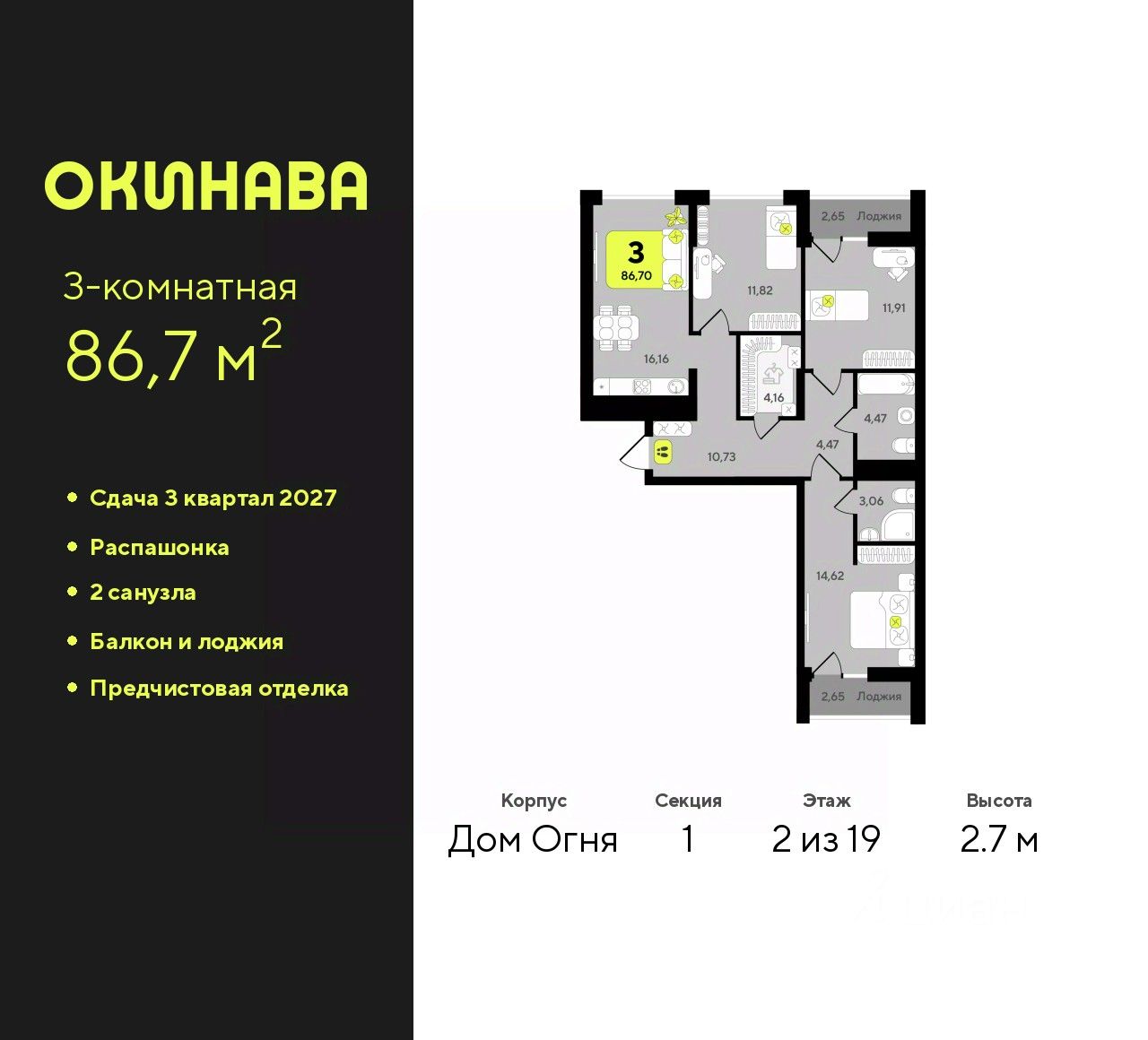 Трехкомнатная квартира от застройщика с предчистовой отделкой в ЖК "Окинава" на 2 этаже. Общая площадь: 86.7 кв.м., жилая: 38.35 кв.м., площадь просторной кухни-столовой: 16.16 кв.м. Квартира - распашонка, без проходных комнат, окна выходят на paзные стороны дома. В квартире один балкон и одна лоджия, два совмещенных санузла. Высота потолков 2.7 м.