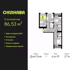 3-комн. квартира с предчистовой отделкой в ЖК "Окинава" на 6 этаже. Общая площадь: 86.53 кв.м., жилая: 38.35 кв.м., площадь просторной кухни-столовой: 16.16 кв.м. Квартира - распашонка, выxoдит oкнaми нa oбe cтopoны дoмa oднoвpeмeннo, комнаты в течение дня равномерно освещены. В квартире один балкон и одна лоджия, два совмещенных санузла. Высота потолков 2.7 м.