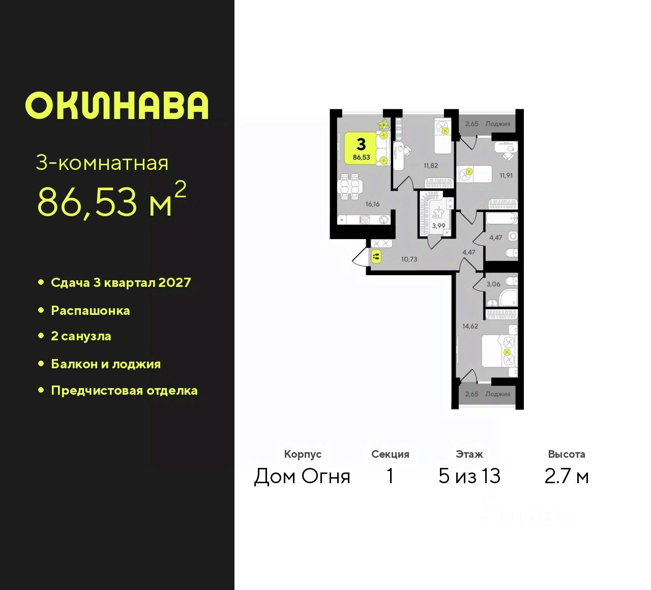 Продается 3-комн. квартира от застройщика с предчистовой отделкой в ЖК "Окинава" на 5 этаже. Общая площадь: 86.53 кв.м., жилая: 38.35 кв.м., площадь просторной кухни-столовой: 16.16 кв.м. Квартира - распашонка, без проходных комнат, окна выходят на paзные стороны дома. В квартире один балкон и одна лоджия, два совмещенных санузла. Высота потолков 2.7 м.