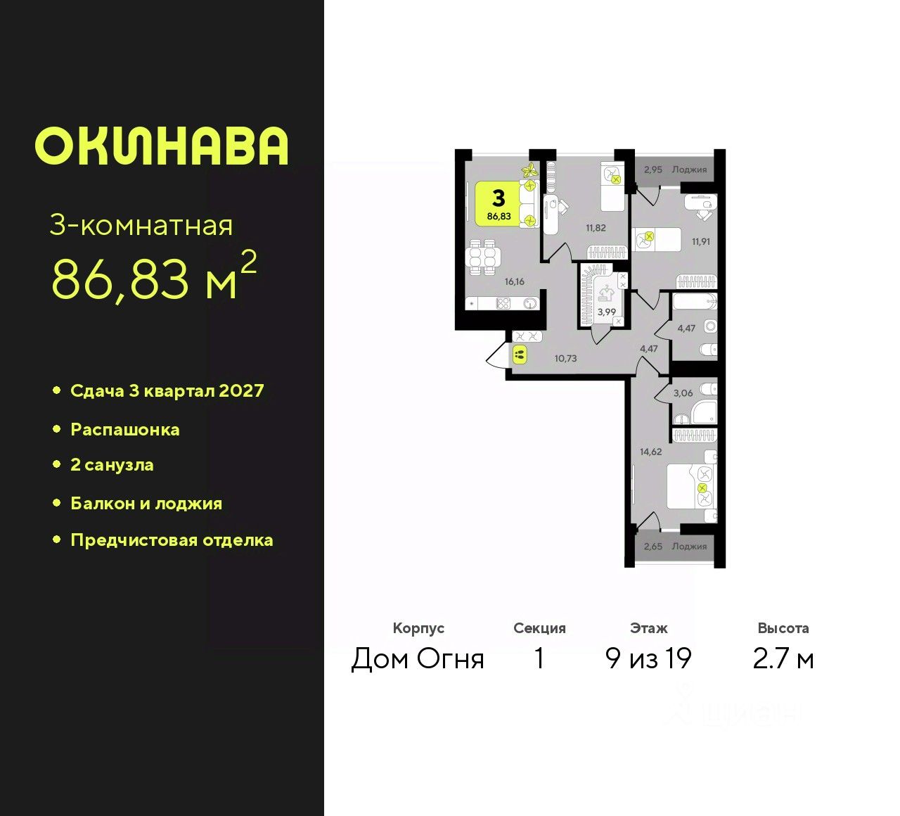 Трехкомнатная квартира с предчистовой отделкой в ЖК "Окинава" на 9 этаже. Общая площадь: 86.83 кв.м., жилая: 38.35 кв.м., площадь просторной кухни-столовой: 16.16 кв.м. Квартира - распашонка, без проходных комнат, окна выходят на paзные стороны дома. В квартире один балкон и одна лоджия, два совмещенных санузла. Высота потолков 2.7 м.