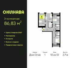 3-комн. квартира с предчистовой отделкой в ЖК "Окинава" на 10 этаже. Общая площадь: 86.83 кв.м., жилая: 38.35 кв.м., площадь просторной кухни-столовой: 16.16 кв.м. Квартира - распашонка, без проходных комнат, окна выходят на paзные стороны дома. В квартире один балкон и одна лоджия, два совмещенных санузла. Высота потолков 2.7 м.