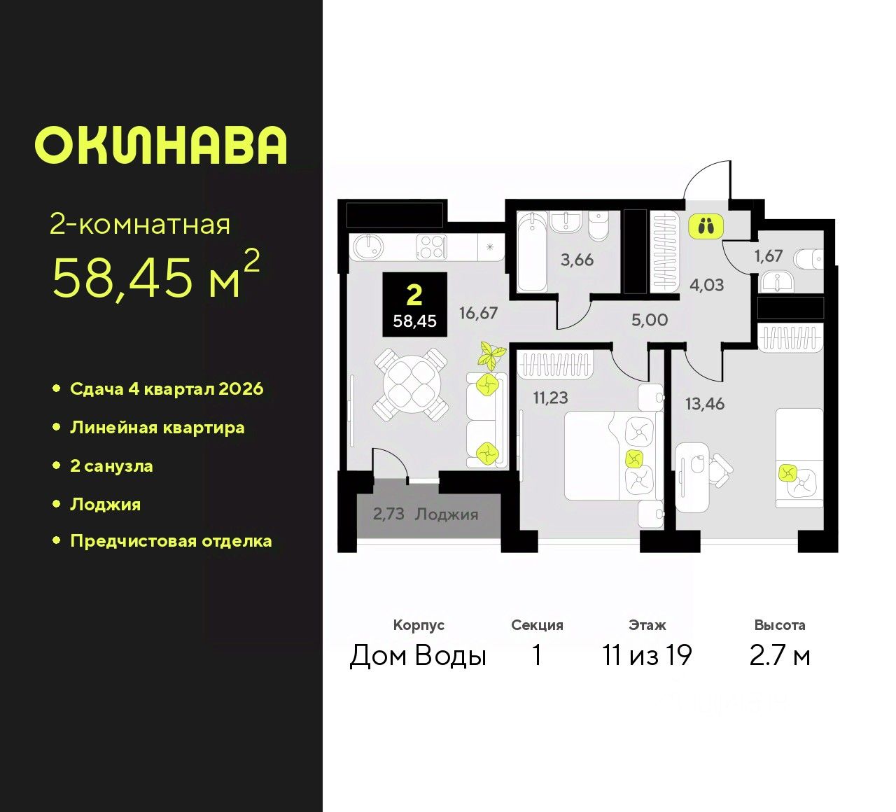 Продается 2-комн. квартира с предчистовой отделкой в ЖК "Окинава" на 11 этаже. Общая площадь: 58.45 кв.м., жилая: 24.69 кв.м., площадь просторной кухни-столовой: 16.67 кв.м. Комнаты изолированные, все окна выходят на одну сторону. В квартире одна лоджия, один совмещенный и один раздельный санузел. Высота потолков 2.7 м.