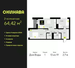 Двухкомнатная квартира от застройщика с предчистовой отделкой в ЖК "Окинава" на 13 этаже. Общая площадь: 64.42 кв.м., жилая: 26.39 кв.м., площадь просторной кухни-столовой: 16.78 кв.м. Квартира угловая, очень светлая, естественная вентиляция при открытии окон. В квартире одна лоджия, один совмещенный и один раздельный санузел. Высота потолков 2.7 м.