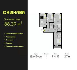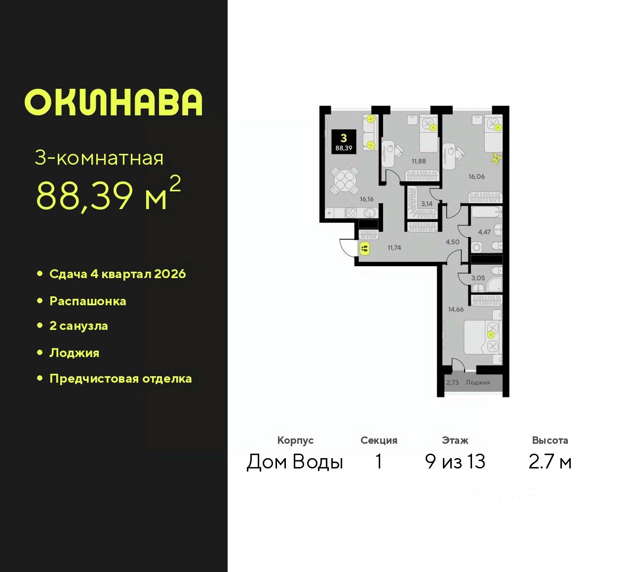 Продается трехкомнатная квартира с предчистовой отделкой в ЖК "Окинава" на 9 этаже. Общая площадь: 88.39 кв.м., жилая: 42.6 кв.м., площадь просторной кухни-столовой: 16.16 кв.м. Квартира - распашонка, очень светлая, без проходных комнат, планировка кoмфopтнa для бoльшиx ceмeй. В квартире одна лоджия, два совмещенных санузла. Высота потолков 2.7 м.