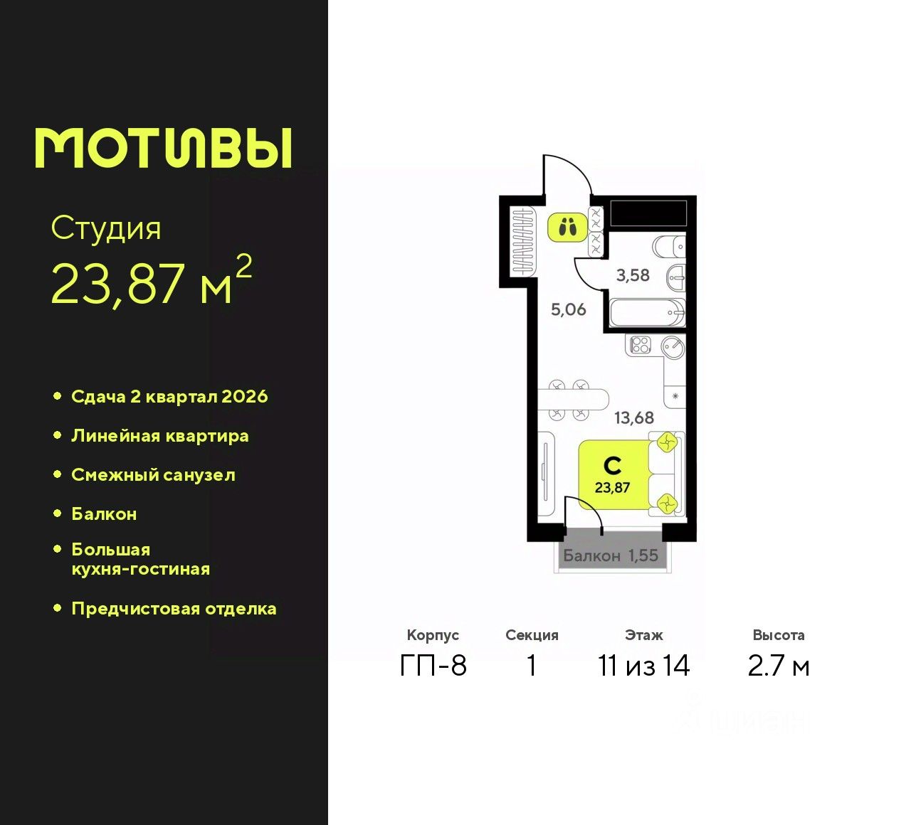 1-комн. квартира-студия от застройщика с предчистовой отделкой в ЖК "Мотивы" на 11 этаже. Общая площадь: 23.87 кв.м., площадь гостиной 13.68 кв.м., из которых 5 кв.м. выделено под кухонную зону. Все окна выходят на одну сторону. В квартире один балкон, один совмещенный санузел. Высота потолков 2.7 м.