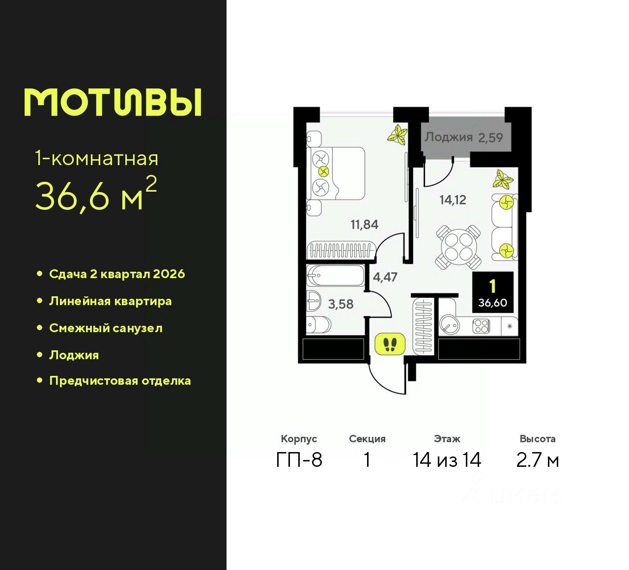 1-комн. квартира с предчистовой отделкой в ЖК "Мотивы" на 14 этаже. Общая площадь: 36.6 кв.м., жилая: 11.84 кв.м., площадь просторной кухни-столовой: 14.12 кв.м. Все окна выходят на одну сторону. В квартире одна лоджия, один совмещенный санузел. Высота потолков 2.7 м.