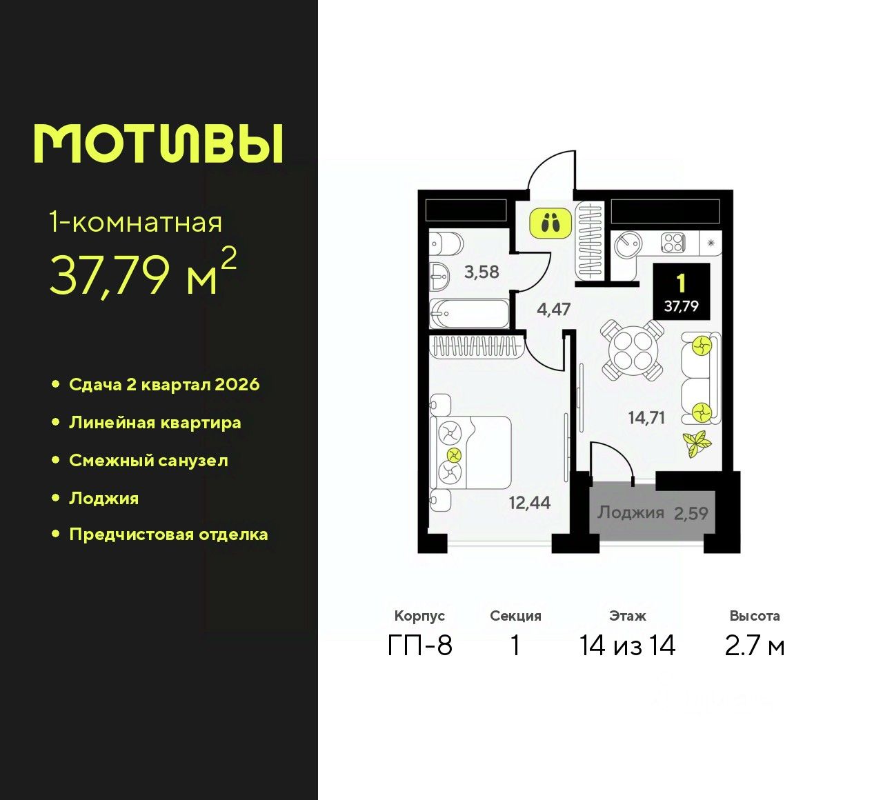 1-комн. квартира с предчистовой отделкой в ЖК "Мотивы" на 14 этаже. Общая площадь: 37.79 кв.м., жилая: 12.44 кв.м., площадь просторной кухни-столовой: 14.71 кв.м. Все окна выходят на одну сторону. В квартире одна лоджия, один совмещенный санузел. Высота потолков 2.7 м.