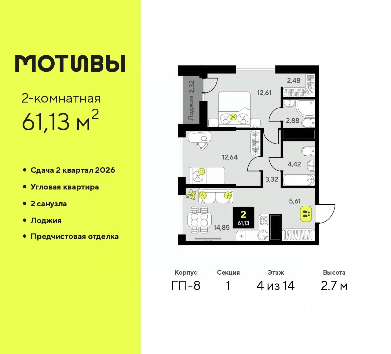 Двухкомнатная квартира от застройщика с предчистовой отделкой в ЖК "Мотивы" на 4 этаже. Общая площадь: 61.13 кв.м., жилая: 25.25 кв.м., площадь просторной кухни-столовой: 14.85 кв.м. Квартира угловая, очень светлая, естественная вентиляция при открытии окон. В квартире одна лоджия, два совмещенных санузла. Высота потолков 2.7 м.