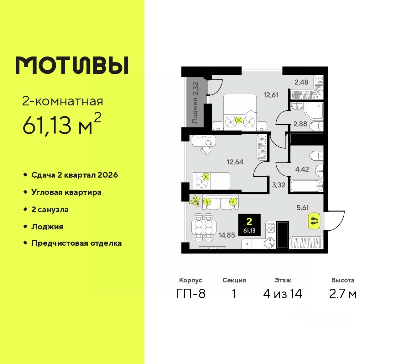 Продается 2-комн. квартира с предчистовой отделкой в ЖК "Мотивы" на 4 этаже. Общая площадь: 61.13 кв.м., жилая: 25.25 кв.м., площадь просторной кухни-столовой: 14.85 кв.м. Угловая квартира, очень светлая, естественная вентиляция при открытии окон. В квартире одна лоджия, два совмещенных санузла. Высота потолков 2.7 м.