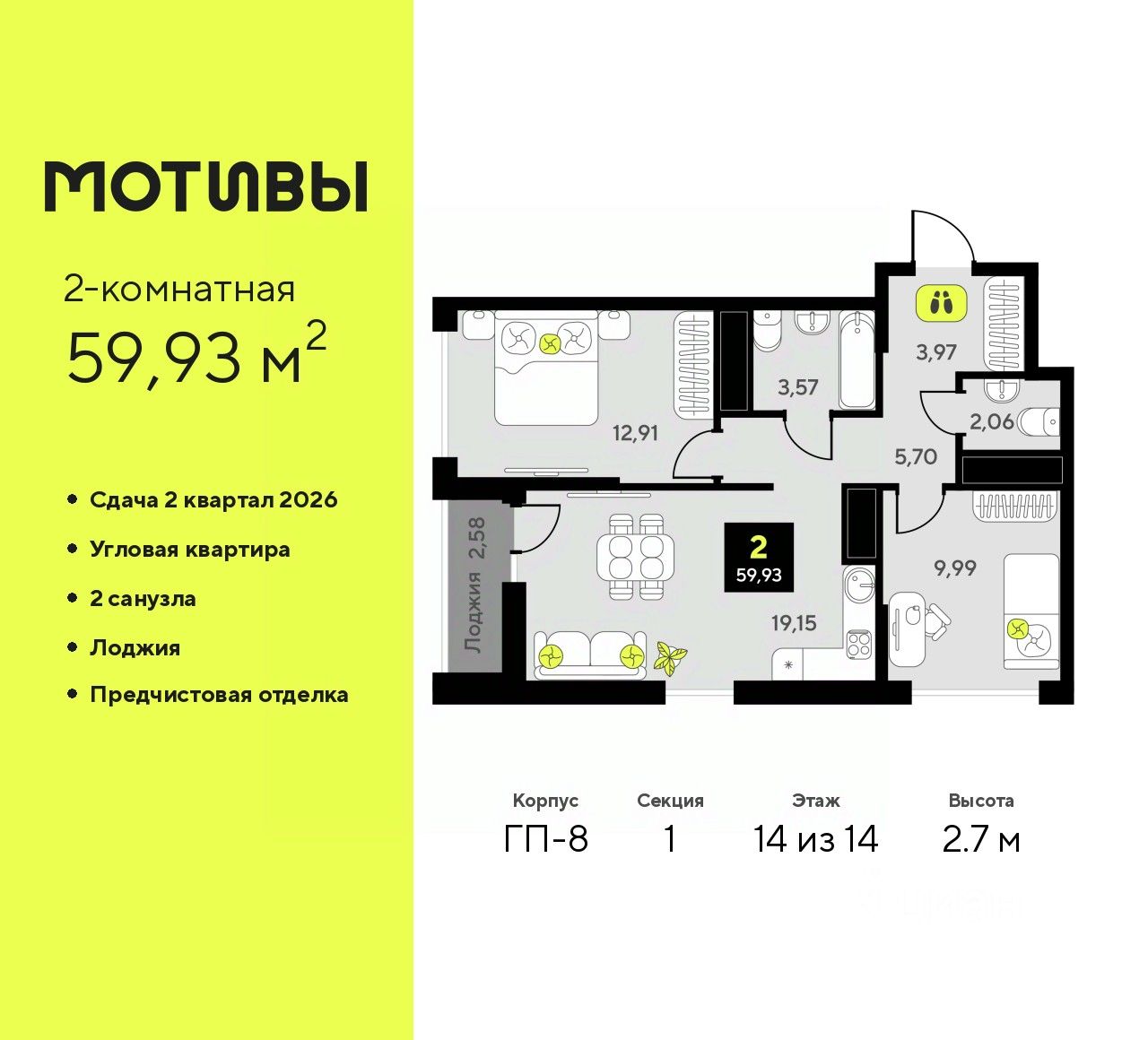 2-комн. квартира от застройщика с предчистовой отделкой в ЖК "Мотивы" на 14 этаже. Общая площадь: 59.93 кв.м., жилая: 22.9 кв.м., площадь просторной кухни-столовой: 19.15 кв.м. Квартира угловая, идеально подойдет любителям тишины и панорамных видов. В квартире одна лоджия, один совмещенный и один раздельный санузел. Высота потолков 2.7 м.